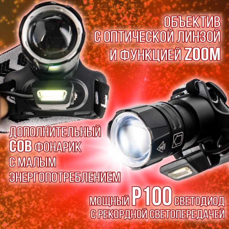 Фонарь на голову аккумуляторный GL-Т37-Р100+СОВ (мощный диод Р100+СОВ, 3 аккумулятора, зарядка USB, power bank)