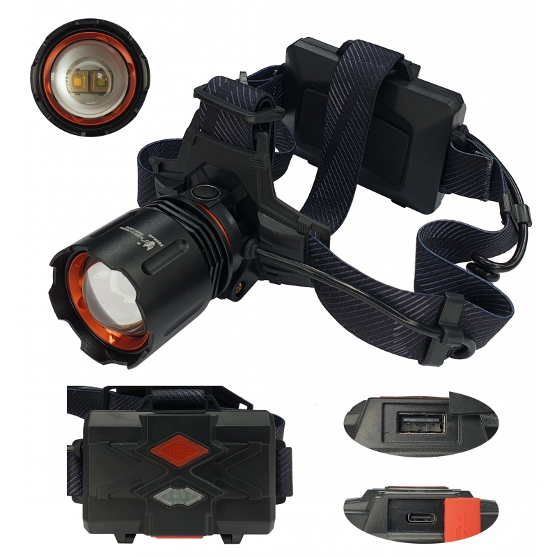 Фонарь налобный 8079-TG-3 (акк.18650-3шт, белый+желтый диод TG, разъем Type-C, power bank)