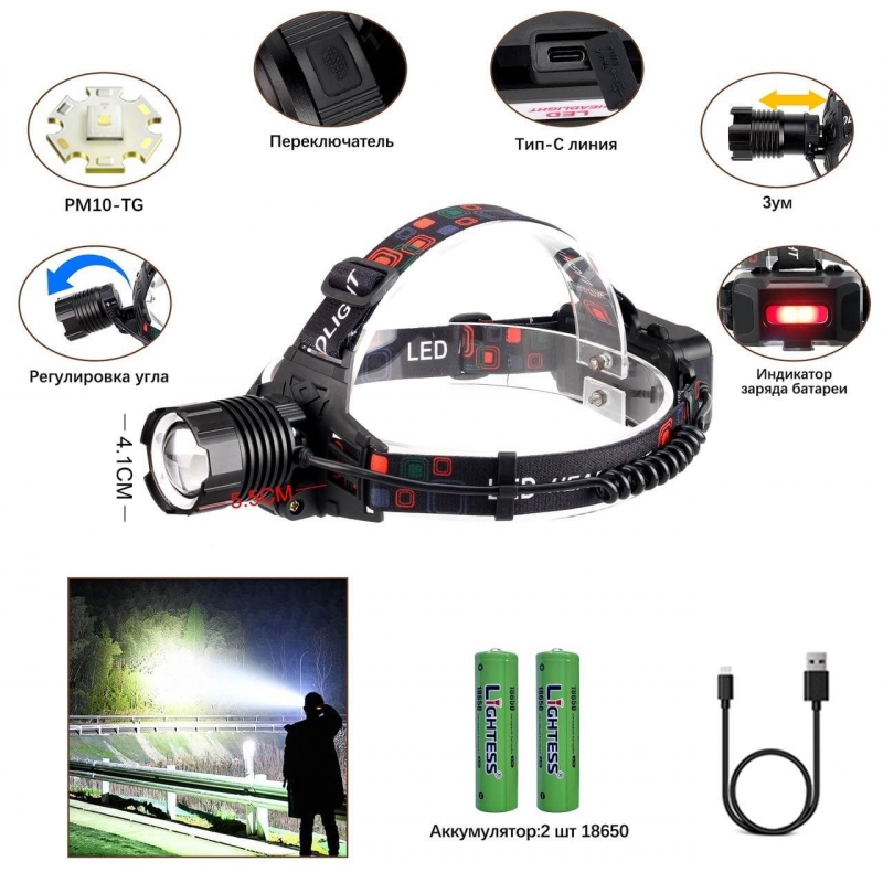 Модель T62-TG - многофункциональный, аккумуляторный, сверхмощным свечением налобный фонарь. Особенностью является светодиод нового поколения (новинка 2023г) «РМ10-TG » с улучшенной теплоотдачей, рекордными показателями светопередачи, позволяющий увеличить световой поток, уменьшить расход потребляемой энергии и увеличить продолжительность его срока службы. Дальность и широкий угол освещения выполняет объектив с оптической линзой и функцией Zoom, позволяющий рассеивать световой пучок от широкого до узконаправленного пятна, в зависимости от потребности пользователя. Кнопка включения/выключения расположена сверху, что очень удобно для пользователя. Крепление на голову с углом наклона до 90градусов. Режим работы диода TG: 100%, 50%, SOS. Накладка разъема питания входа/выхода, кнопки вкл/выкл изготовлены из прорезиненного материала, что обеспечивает высокую герметизацию и защиту от пыли и влаги. Качественный РС материал для лампового стекла и линз делает их прочными, прозрачными и жароустойчивыми. Корпус фонаря из анодированного алюминия. Корпус для размещения/замены/заряда 3х аккумуляторных батарей из ударопрочного пластика и размещается с тыльной части головы. На нем размещен СОВ светодиод, выполняющий роль дополнительного кемпингового фонарика. Режим его работы: яркий, экономичный, красный и моргающий красный, для обозначения носителя в темное время. Так же на корпус встроен индикатор уровня заряда из 4х диодов со шкалой в %, разъем питания Type-C и USB разъем для использования фонаря в роли Power Bank, для зарядки электронных мобильных устройств. Сфера применения данной модели от бытового до профессионального использования, а современный дизайн фонаря послужит хорошим подарком для поклонников активного образа жизни.