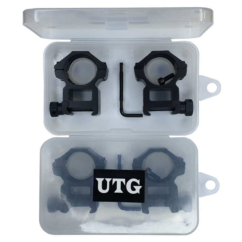 Модель кольца UTG – комплект из двух креплений под планку «Weaver» в пластиковом кейсе. Конструкция кронштейна состоит из двух частей. Первая в виде оружейной планки с посадкой 21мм - крепится непосредственно к ствольной коробке оружия и является съемной. Вторая часть дюймовое кольцо, диаметром 25,4мм - крепится и фиксируется на оптику, фонарь или другой аксессуар в надежном и требуемом положении. Внутри кольца наклеена специальная ткань, предотвращающие любое смещение прибора. Конструкция изделия имеет технологическое отверстие, высотой 16мм в виде окна, которое дает возможность прицеливания через открытый прицел оружия (мушка, целик). Материал изделия выполнен из прочного твердого алюминиевого сплава с чернением поверхности, устойчив к коррозии. Монтаж производится с помощью винтов. Данный вид крепления считается универсальным, а тип планки «Weaver» -самой распространенной.