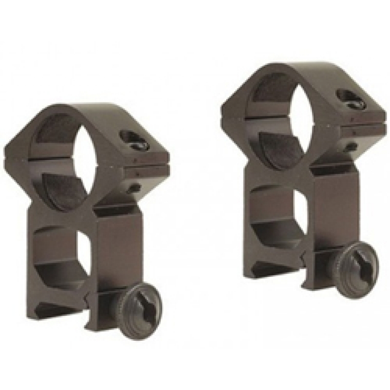Комплект колец – два крепления под планку «Weaver». Конструкция кронштейна состоит из двух частей. Первая в виде оружейной планки с посадкой 21мм - крепится непосредственно к ствольной коробке оружия и является съемной. Вторая часть дюймовое кольцо, диаметром 25,4мм - крепится и фиксируется на оптику, фонарь или другой аксессуар в надежном и требуемом положении. Внутри кольца наклеена специальная ткань, предотвращающие любое смещение прибора. Конструкция изделия имеет технологическое отверстие, высотой 16мм в виде окна, которое дает возможность прицеливания через открытый прицел оружия (мушка, целик). Материал изделия выполнен из прочного твердого алюминиевого сплава с чернением поверхности, устойчив к коррозии. Монтаж производится с помощью винтов под шестигранный ключ. Данный вид крепления считается универсальным, а тип планки «Weaver» -самой распространенной.