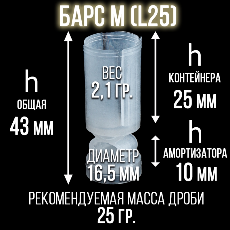 Пыж- контейнер Барс-М(L25) с обтюратором – изделие полиэтиленовое, предназначенное для снаряжения в пластиковые гильзы дробовых, картечных или пулевых охотничьих патронов гладкоствольного оружия 16 калибра. Рекомендованная вместимость дроби 25гр. Отличительной особенность является подобранный специалистами оптимальный размер, что обеспечивает улучшенную обтюрацию пороховых газов и амортизацию дробового снаряда. В пластиковую гильзу заходит плотно и без лишних усилий, упрощая сборку патрона и избегая освинцовку ствола. Является пыжом и одновременно контейнером (выбранного вами снаряда), для создания широкой, равномерной осыпи при стрельбе на короткие и средние дистанции или увеличении резкости и дальности выстрела на дальние расстояния.