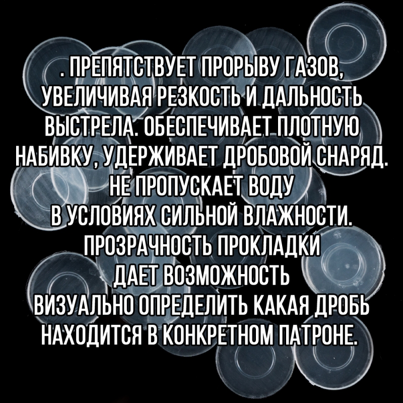 - вид изделия: пластиковая прокладка на дробь либо порох.