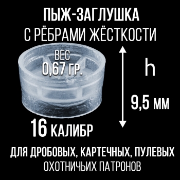 Пыж (заглушка) дробовой – изделие из полиэтилена, предназначенное для снаряжения в металлические гильзы преимущественно дробовых, а также картечных или пулевых охотничьих патронов гладкоствольного оружия. Изделие выполнено в виде конической формы, с расположенными внутри ребрами в виде звезды, для максимальной жесткости и упругости пыжа. Ребра надежно сохраняют заряд, исключают высыпание дроби при применении, транспортировке или хранении, а при выстреле исключают расшатывание патрона в соседнем стволе. Пыж плотно прижимается к стенкам гильзы, надежно фиксирует и закупоривает дробовой заряд в патроне. При использовании заглушки уменьшается дульное давление газов, что способствует повышению кучности и качества стрельбы. Благодаря данной конструкции исключается необходимость в заливке верхней прокладки воском (парафином). После установки, извлечь пыж-заглушку можно, но с большим усилием, с помощью шила или других инструментов.