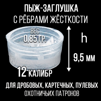 Пыж (заглушка) дробовой – изделие из полиэтилена, предназначенное для снаряжения в металлические гильзы преимущественно дробовых, а также картечных или пулевых охотничьих патронов гладкоствольного оружия. Изделие выполнено в виде конической формы, с расположенными внутри ребрами жесткости в виде звезды, для максимальной упругости пыжа. Ребра надежно сохраняют заряд, исключая высыпание дроби при применении, транспортировке или хранении, а при выстреле исключают расшатывание патрона в соседнем стволе. Пыж плотно прижимается к стенкам гильзы, надежно фиксирует и закупоривает дробовой заряд в патроне. При использовании заглушки уменьшается дульное давление газов, что способствует повышению кучности и качества стрельбы. Благодаря данной конструкции исключается необходимость в заливке верхней прокладки воском (парафином). После установки, извлечь пыж-заглушку можно, но с большим усилием, с помощью шила или других инструментов.