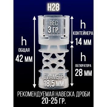 - высота контейнера/ пыж обтюратора/ общая: 14/ 28/ 42мм.