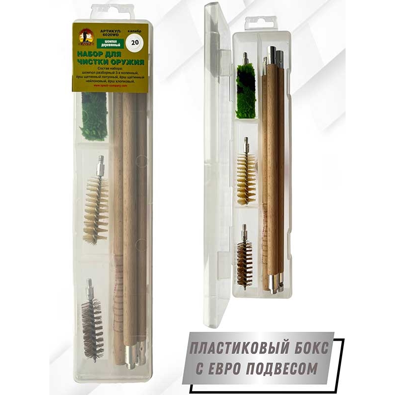 Набор для чистки оружия 20клб в ПРОЗРАЧНОМ КЕЙСЕ с деревянным шомполом (6020WD-20).